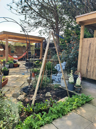 Once the bed was ready, we planted the celery and swiss chard along the paving edge, these were growing elsewhere in pots previously, and then onto building our timber frame for the peas.